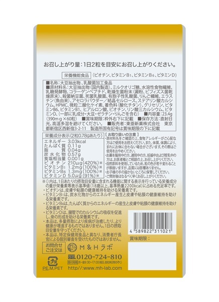 大豆抽出物(国内製造)、ミルクオリゴ糖、水溶性食物繊維、乳糖発酵物、コラーゲンペプチド、乾燥生菌粉末(澱粉、ビフィズス菌乾燥原末)、殺菌納豆菌、死菌乳酸菌、有胞子性乳酸菌、りんご繊維、エラスチン(魚由来)、アセロラパウダー/結晶セルロース、ステアリン酸カルシウム、HPMC、微粒二酸化ケイ素、着色料(酸化チタン)、グリセリン、ビタミンB6、ビタミンB1、 ヒアルロン酸、ビオチン、リン酸三カルシウム、ビタミンD、(一部に乳成分・大豆・ゼラチン・りんごを含む)