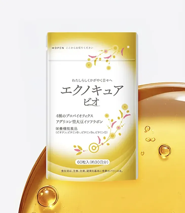 エクノキュアビオは、体内環境を整え、「エクオール産生菌」を働かせる4種のプロバイオティクスと2種の女性ホルモン様成分を含むアグリコン型大豆イソフラボンを配合しております。 産生と活性にアプローチし、ゆらぎ時期特有の体調の変化に悩む女性をサポートします。