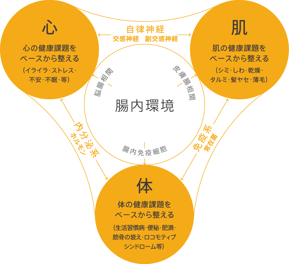 土台となる腸内環境を起点に、からだの内外から包括的にアプローチしていきます。